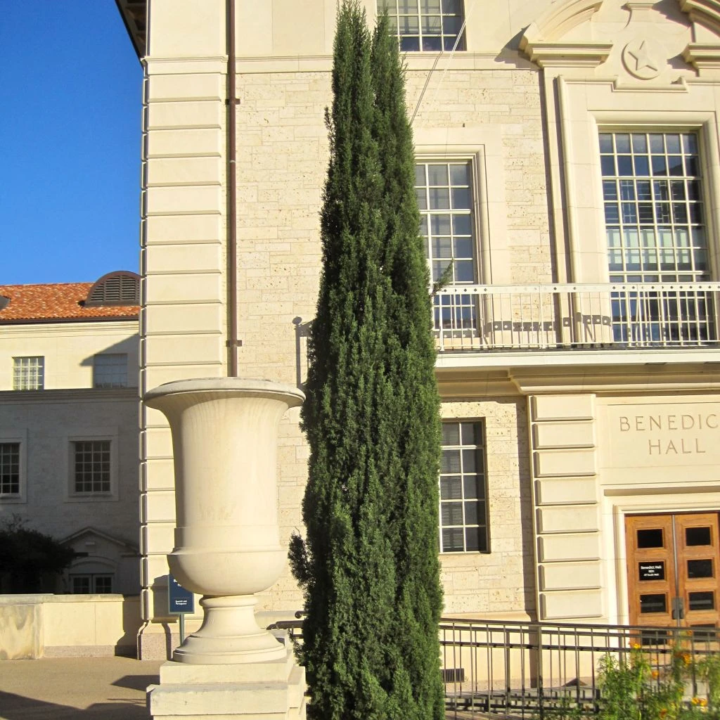 Le Cupressus sempervirens ‘Pyramidalis’, que l’on appelle couramment Cyprès de Provence ou Cyprès de Florence, est une forme au port colonnaire et étroit de ce grand conifère persistant au feuillage vert sombre. Emblématique de la Toscane, cet arbre pousse rapidement durant ses jeunes années, et peut vivre 500 ans, formant à terme cette silhouette caractéristique qui marque de son empreinte les paysages méditerranéens. Ce cyprès est parfait pour ponctuer une entrée, ou structurer un grand espace. C’est un arbre précieux pour les jardins du sud, car il s’accommode de sols caillouteux et pauvre, de la sécheresse et des vents violents.