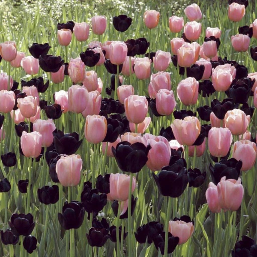 Un assortiment de 50 tulipes roses et noires aux coloris complémentaires pour une composition toute en contrastes. Deux variétés, Menton et Reine de la Nuit, emballées séparément et étiquetées.